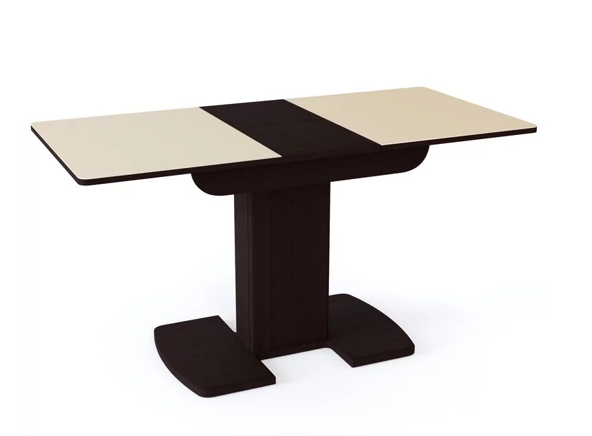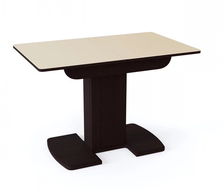 Небольшой практичный раздвижной стол. Каркас модели – ЛДСП в одном из двух цветов, столешница имеет удобную прямоугольную форму и покрыта матовым или глянцевым закаленным стеклом. Встроенный механизм раскладки “бабочка” позволяет увеличить компактный размер на 32 см. Опорой служит одна нога, переходящая ближе к полу в плоское основание.