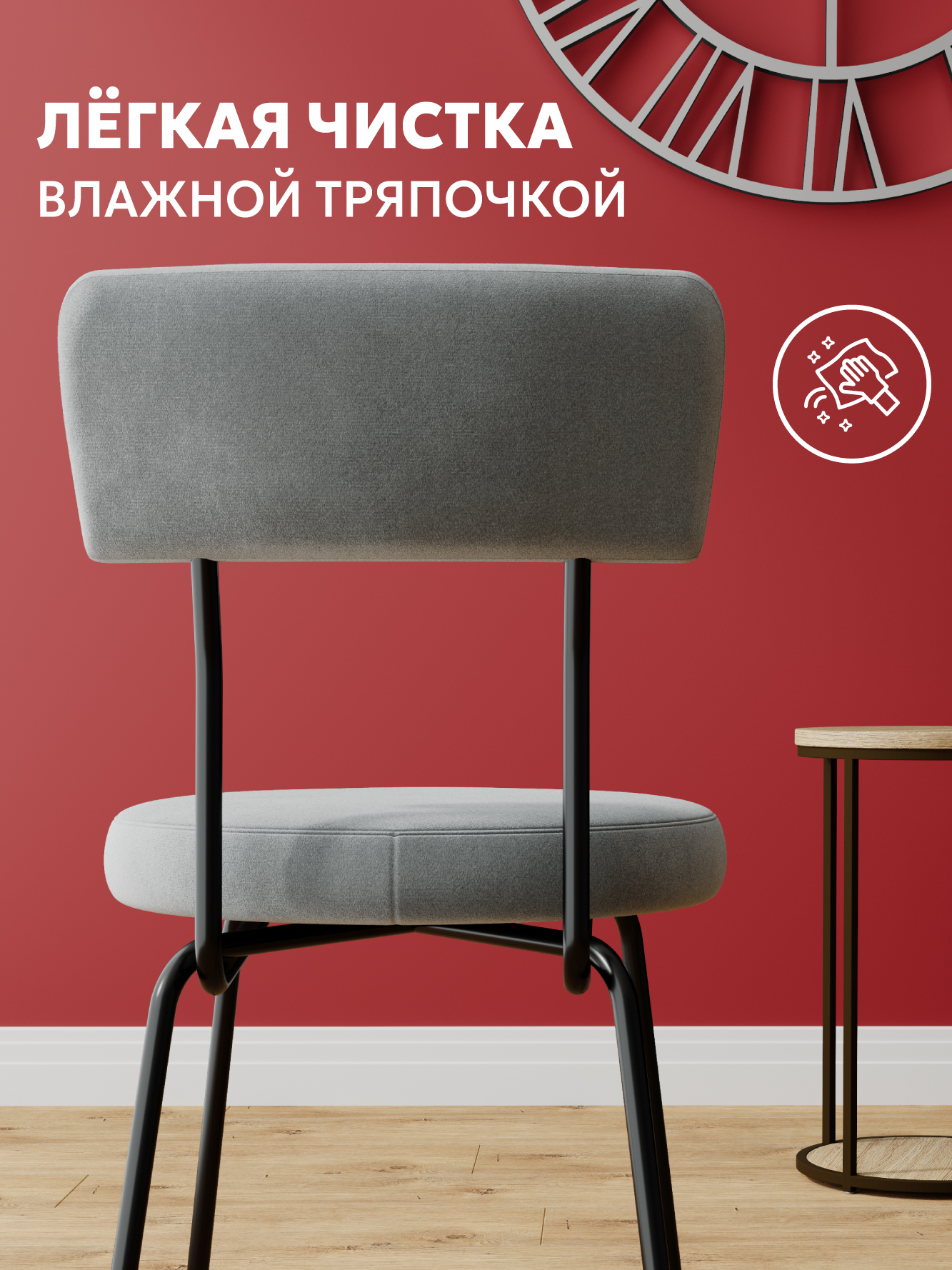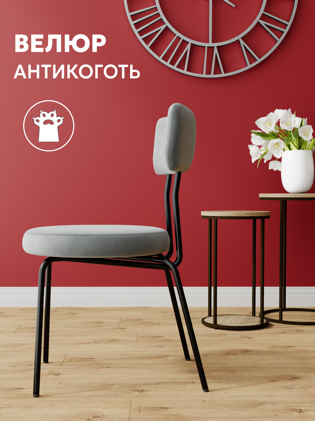 Самые приятные тактильные ощущения он сочетает с максимальной практичностью. Любые загрязнения легко отмывается влажной тряпочкой в мыльном растворе. Велюр не имеет запаха, при его изготовлении не используются химические пропитки. Он безопасен для детей и домашних животных и даже не боится кошачьих и собачьих когтей. Велюр антикоготь — это практичное решения для любых помещений. Универсальный стиль стула, его воздушные модерновые линии сочетаются с практически любым интерьером гостиной, кухни, офиса и даже детской. Стул выдерживает нагрузку в 120 килограмм, так как каркас стула изготовлен из стального профиля холодного проката с порошковой покраской в черный цвет.