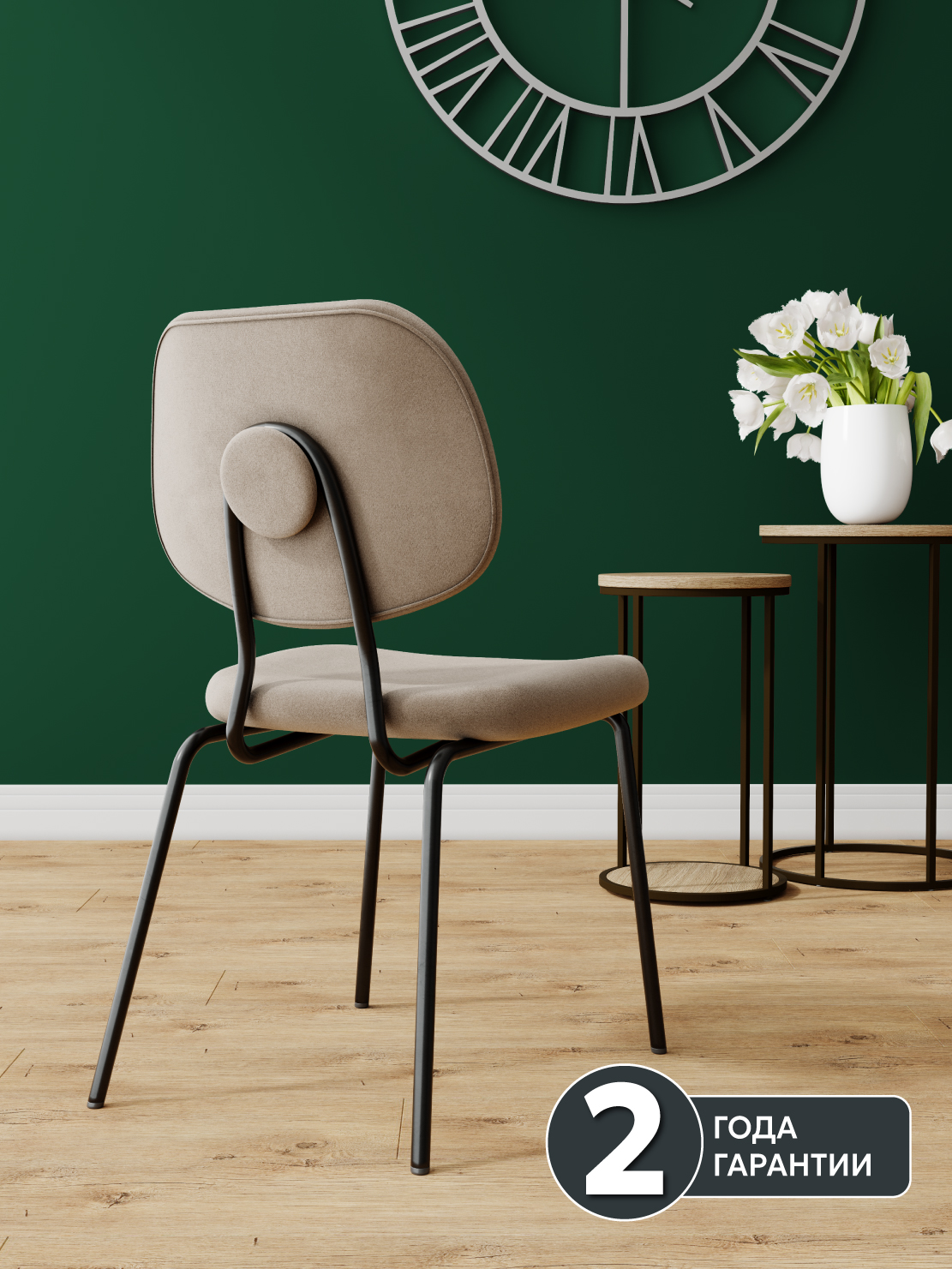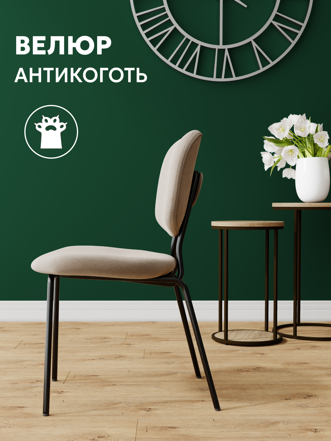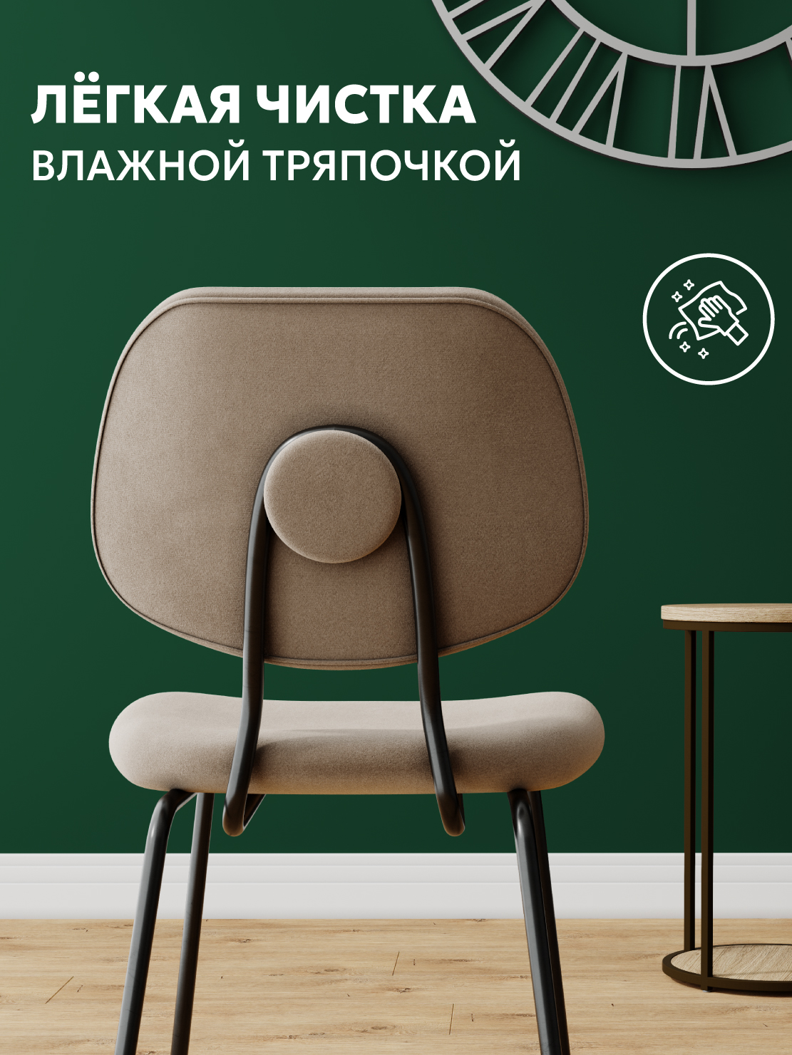 Обивка стульев изготовлена из бархатного премиум-велюра с великолепными органолептическими качествами. Длина велюра подтверждается его "пальчиковым" эффектом.