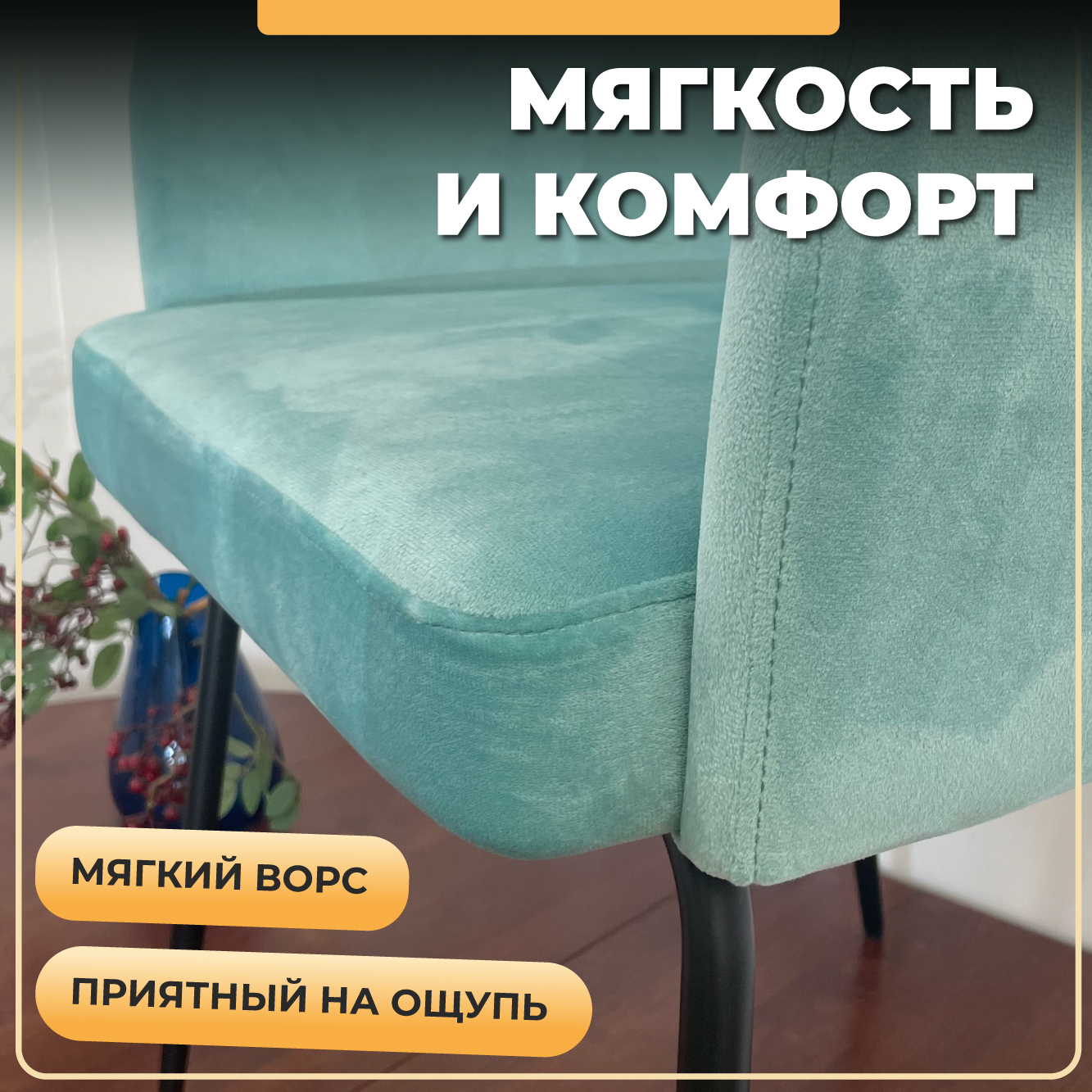 влажной тряпочкой в мыльном растворе за пару секунд. При этом велюр не имеет никаких химических пропиток и безопасен для детей и животных. Коты и собаки не портят его своими когтями и не оставляют зацепок. Конструкция стула на ногах из стали холодного проката на 20% прочнее обычного металла.