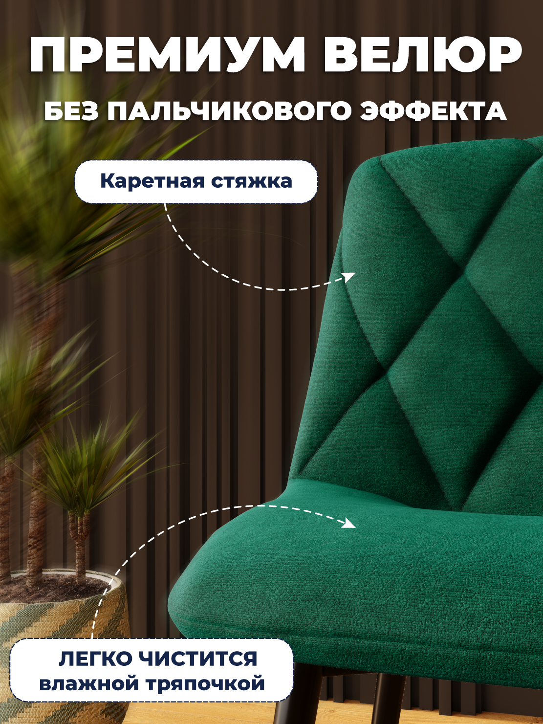 Любители мягких стульев делятся на два непримиримых лагеря. Первые хотят бархатной нежности, а значит им нужен велюр с длинным ворсом. А вторые также непримиримо ненавидят следы, которые остаются на таких стульях от прикосновений. При этом ни тем ни другим не нравится велюр с коротким ворсом, который больше напоминает микрофибру, чем бархат. Примирить и понравиться всем может наш новый стул! Проверенная модель с красивой каретной стяжкой на спинке имеет велюр средней длины с особым плетением. Поверхность стула напоминает уютное махровое полотенце. Велюр не имеет пальчикового эффекта и не оставляет следов после сидения. Ткань легко чистится влажной тряпочкой в мыльном растворе практически от любых загрязнений. Особая структура ткани обладает еще более высокой теплопроводностью - на стуле не жарко сидеть даже в самый зной.
