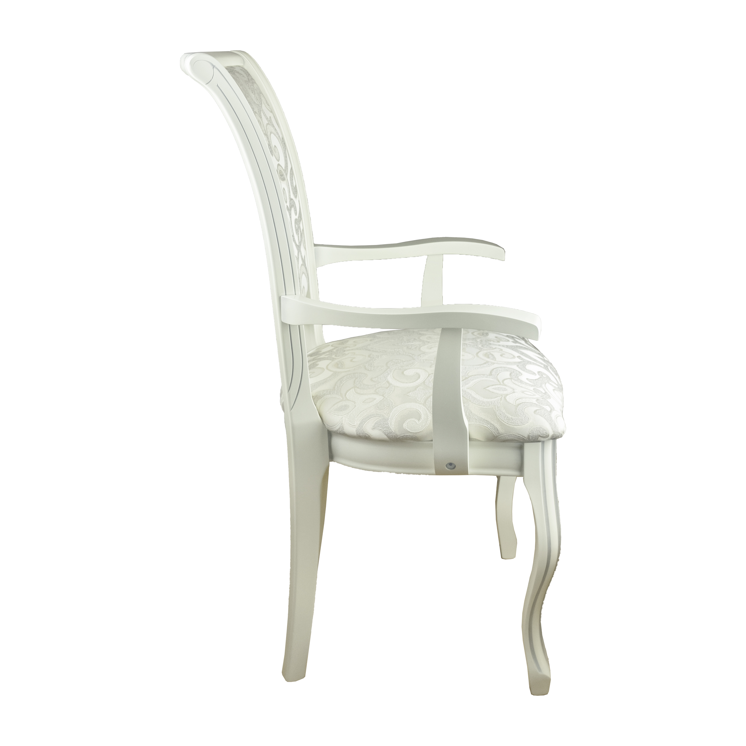 Этот стул-кресло выглядит невероятно стильно: изогнутые ножки и резной декор на каркасе придают ему элегантности. Мягкая спинка с оптимальным углом наклона, удобные подлокотники, глубокое сиденье - стул просто создан для тех, кто ценит непревзойденный комфорт. Массив березы, из которого он изготовлен, - невероятно прочный и надежный материал, такие стулья будут радовать вашу семью не один десяток лет. Оттенок и фактуру ткани для обивки вы выбираете самостоятельно из нашего огромного ассортимента, так же как и тонировку дерева.